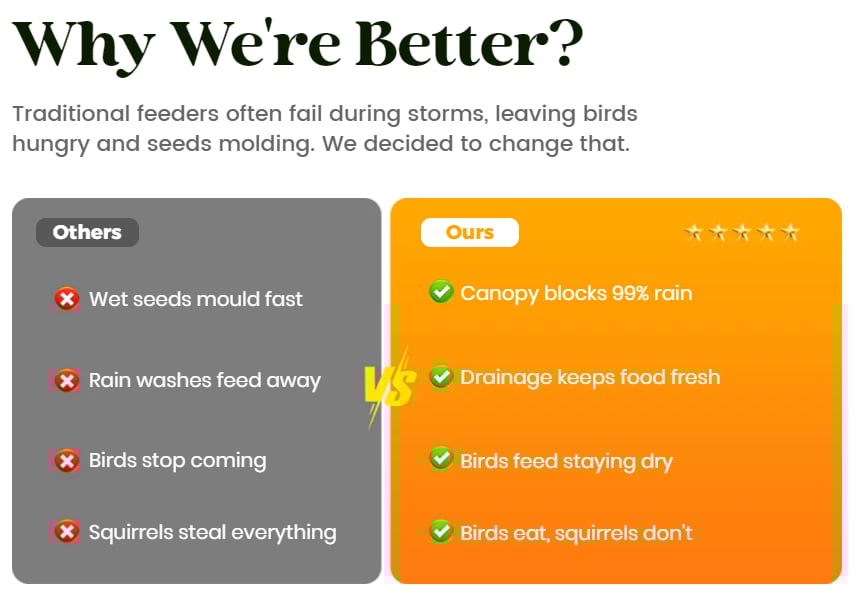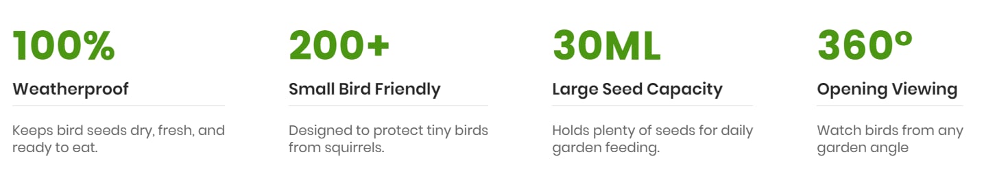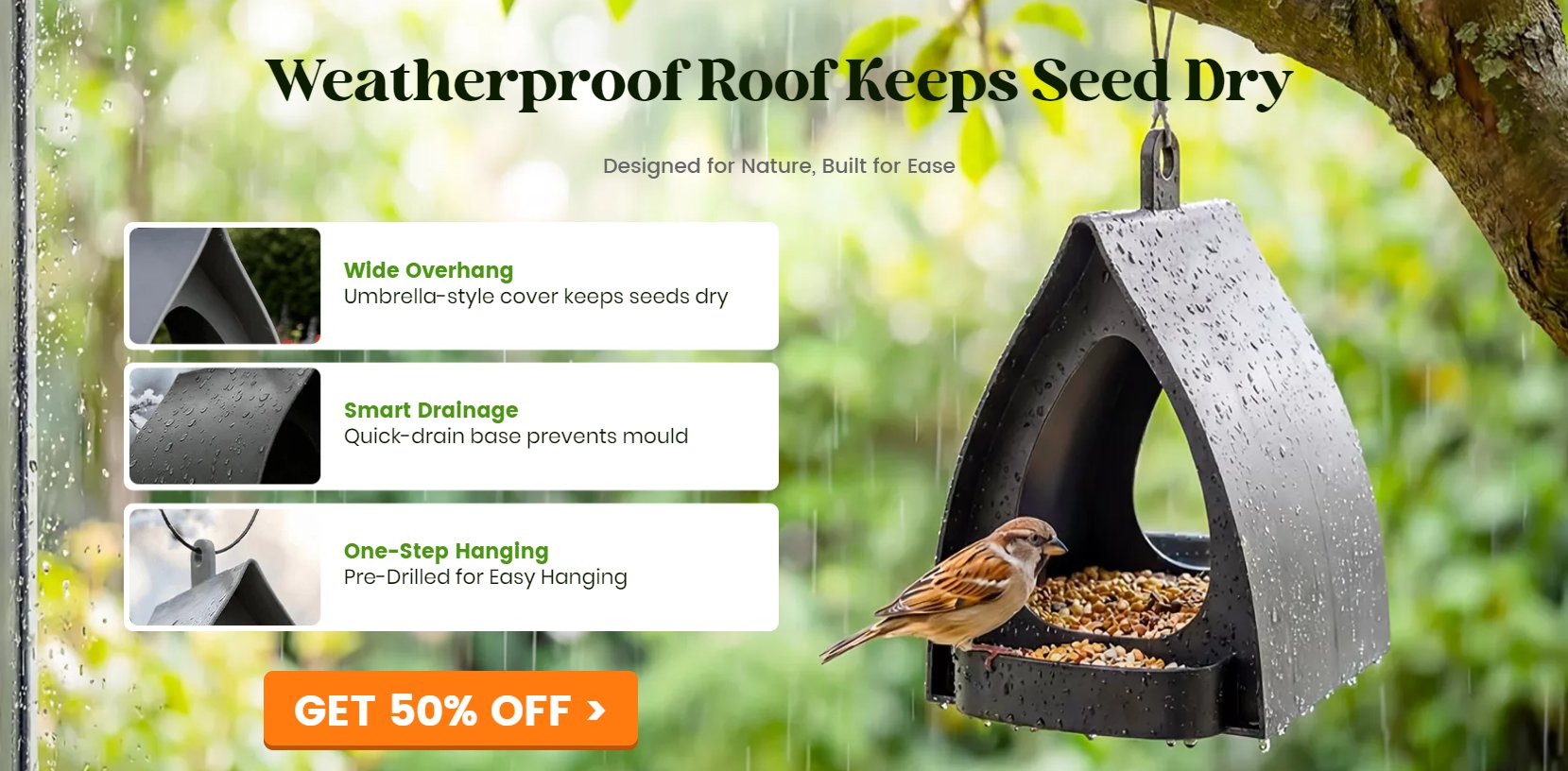 WEATHER-PROTECTIVE ROOF - Shields birdseed from rain and harsh sun, ensuring the food stays fresh and dry, which attracts more birds and reduces waste and spoilage.